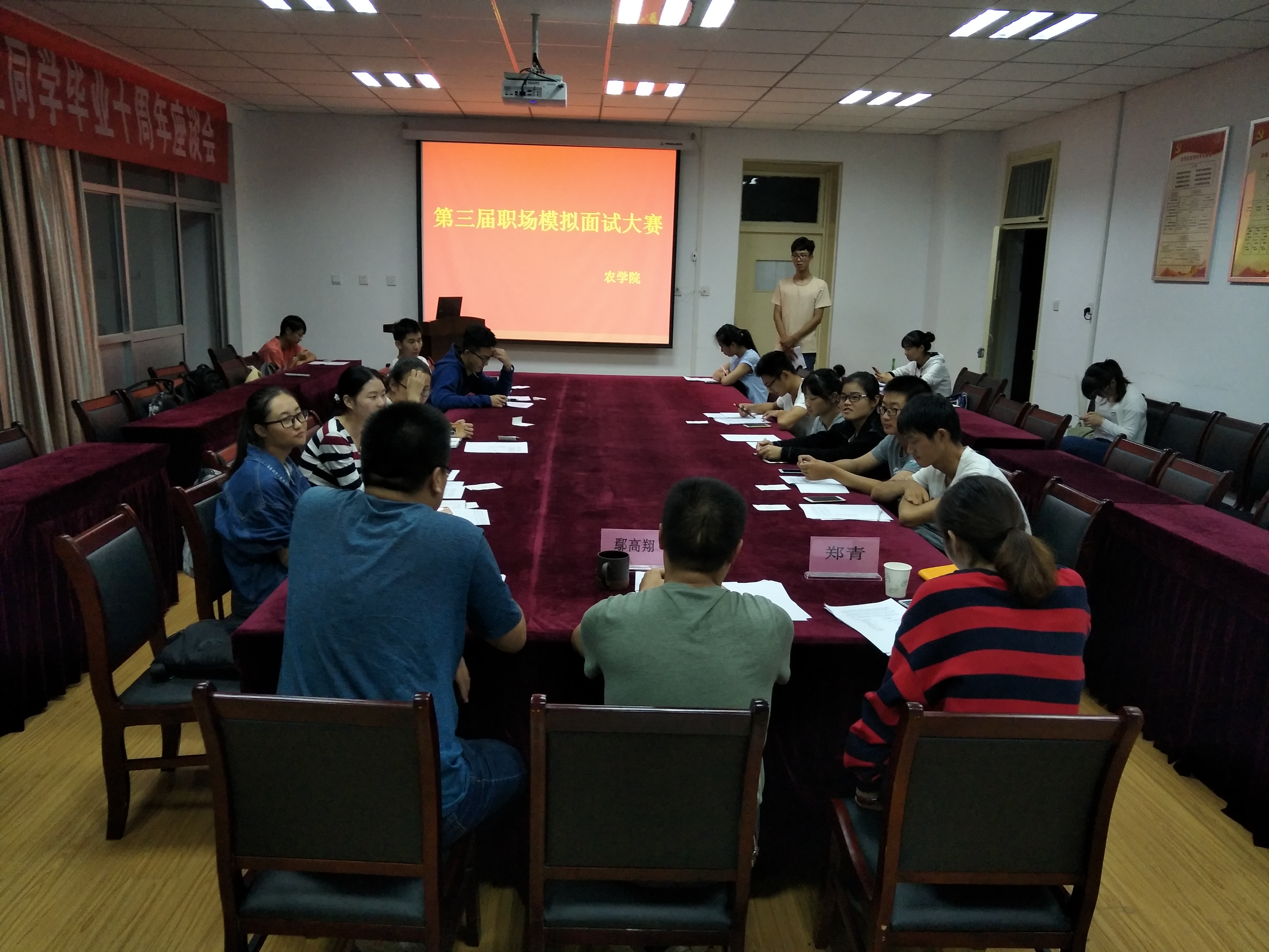为帮助大学生提供一个求职面试的实践平台,指导学生正确处理好学习与就业发展之间的问题。9月25日晚7点农学院在十教518举办了别开生面的第三届“青农乌托邦”职场模拟面试大赛。比赛邀请了学院党委副书记鄢高翔、团委仇飞老师和郑青老师担任评委。