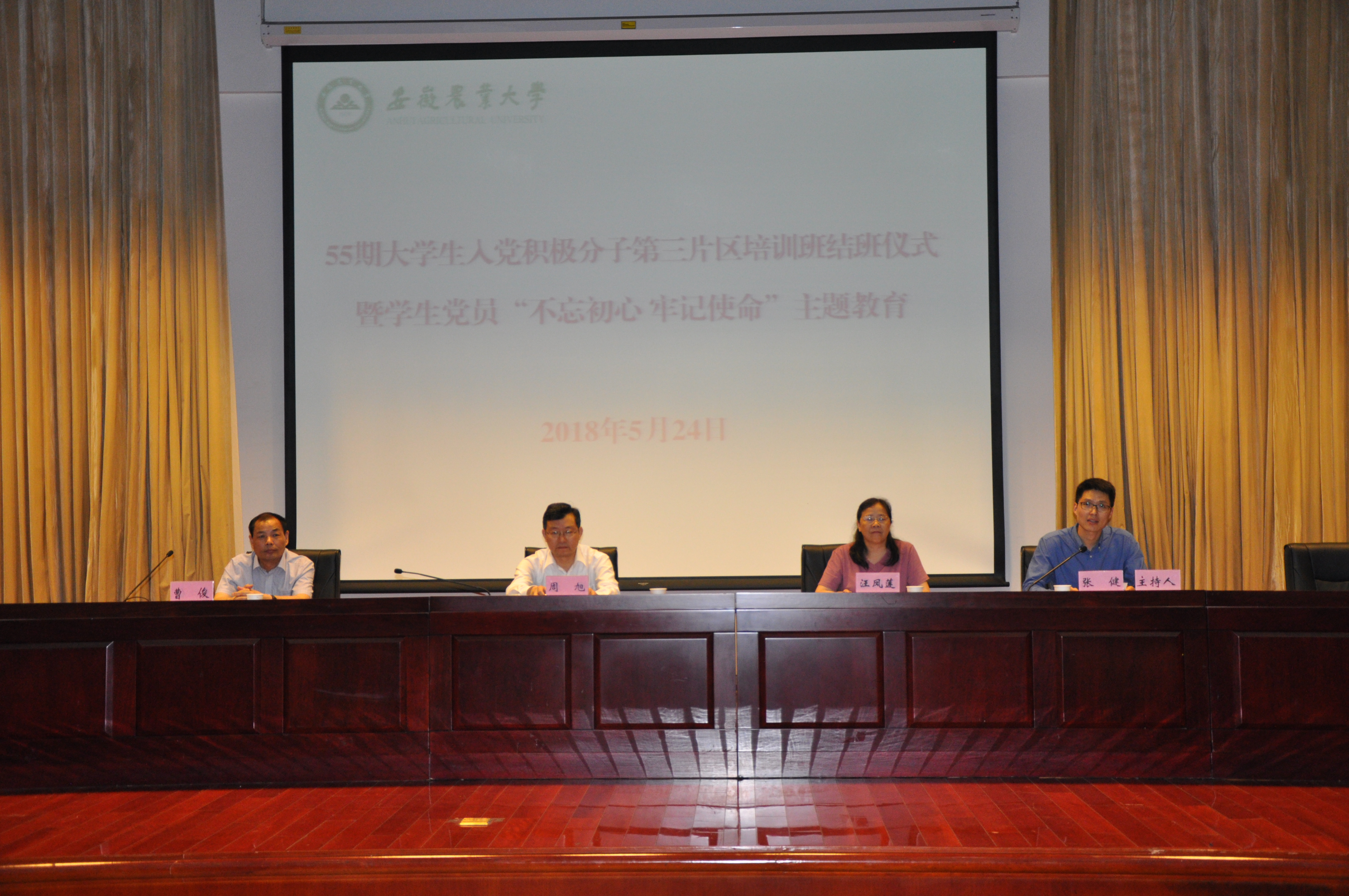 本网讯 5月24日晚,第三片区分党校在学校一号报告厅举行55期入党积极分子培训班结业仪式暨学生党员“不忘初心 牢记使命”主题教育活动。校党委常委、组织部部长、党校常务副校长周旭,信息与计算机学院党委书记曹俊、生命科学学院党委书记张健、资源与环境学院党委副书记张晓伟、农学院党委书记汪凤莲出席大会。第三片区分党校班主任、学生党员及55期入党积极分子参加大会。会议由张健主持。